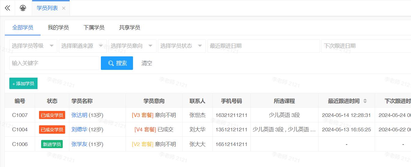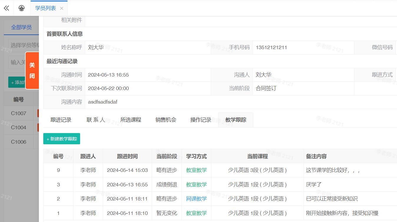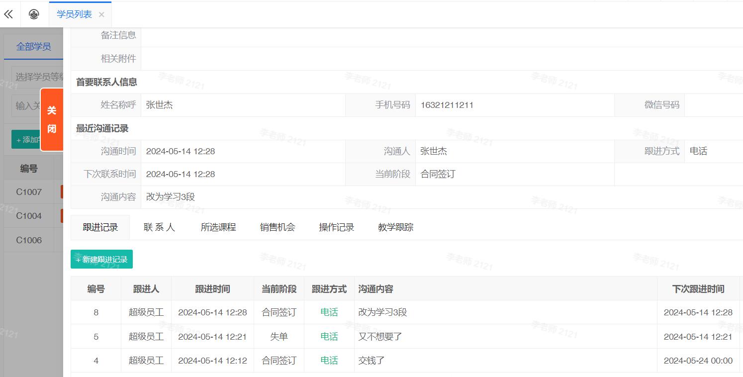 完备的学员跟进功能,包含 商机,跟进记录,签单,教学管理,相关课件 等...